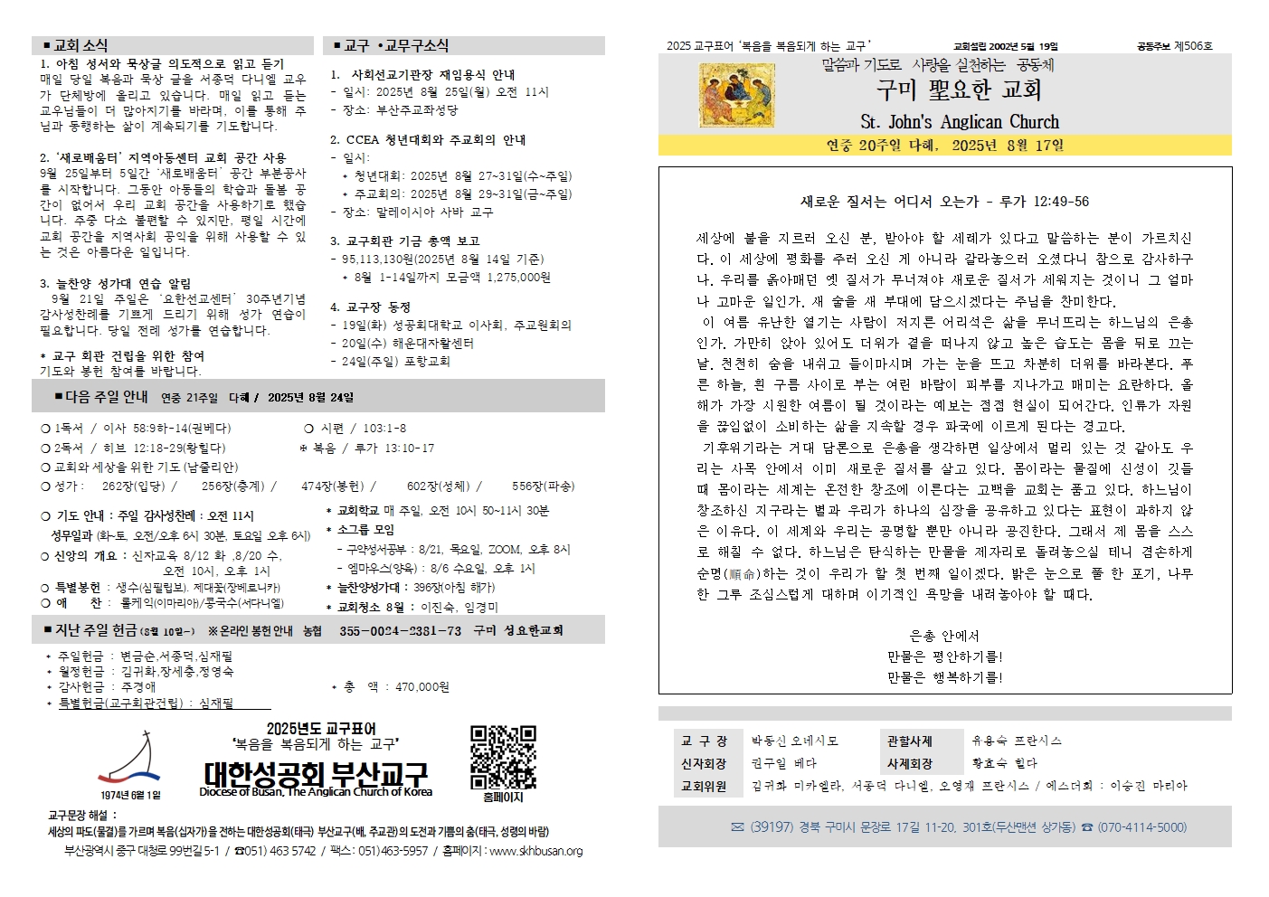 | 연중 19주일(2025. 8. 10.) 성요한교회 감사성찬례 주보 (1) | 2025.08.08 |
