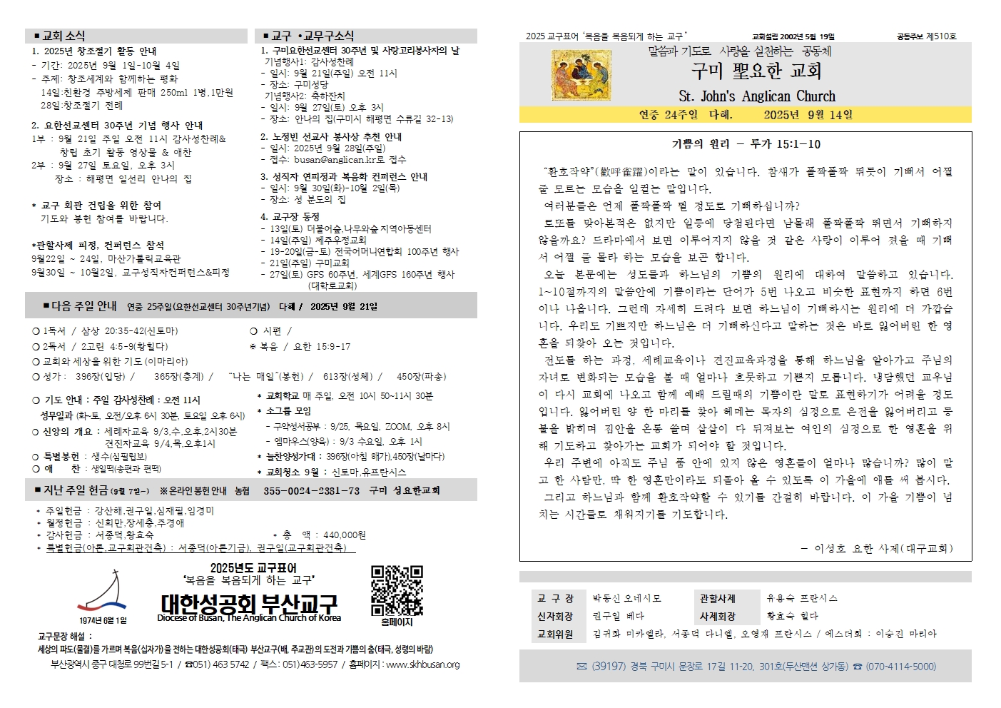 | 연중 23주일(여성선교주일, 2025. 9. 7.)성요한교회 감사성찬례 주보 (0) | 2025.09.05 |