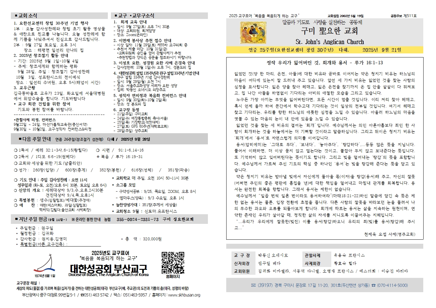 | 연중 23주일(여성선교주일, 2025. 9. 7.)성요한교회 감사성찬례 주보 (0) | 2025.09.05 |