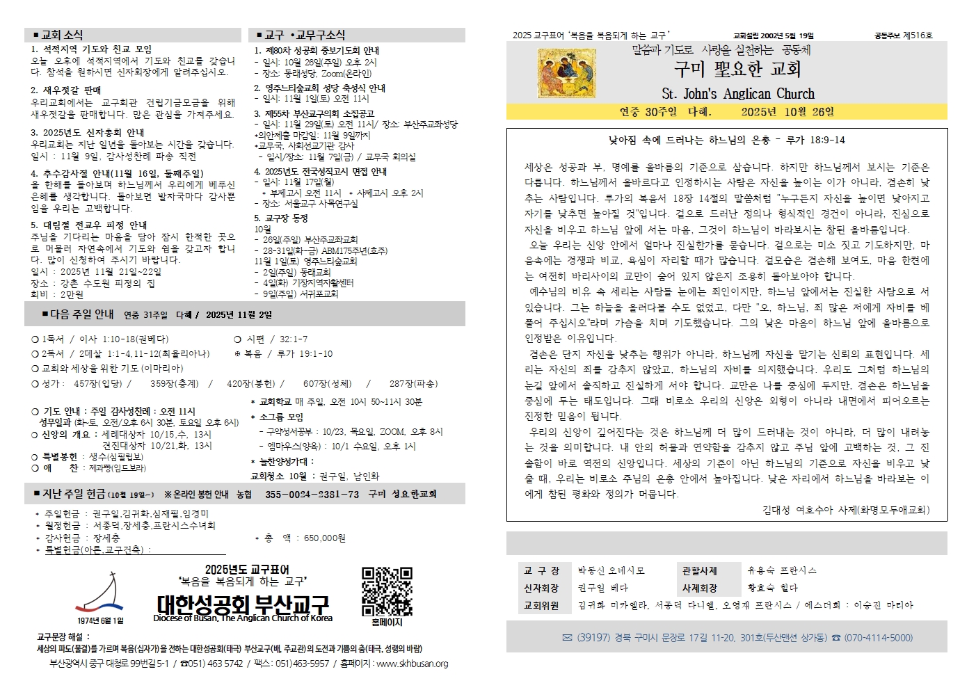 | 연중 31주일(2025. 11. 2)성요한교회 감사성찬례 주보 (0) | 2025.10.31 |