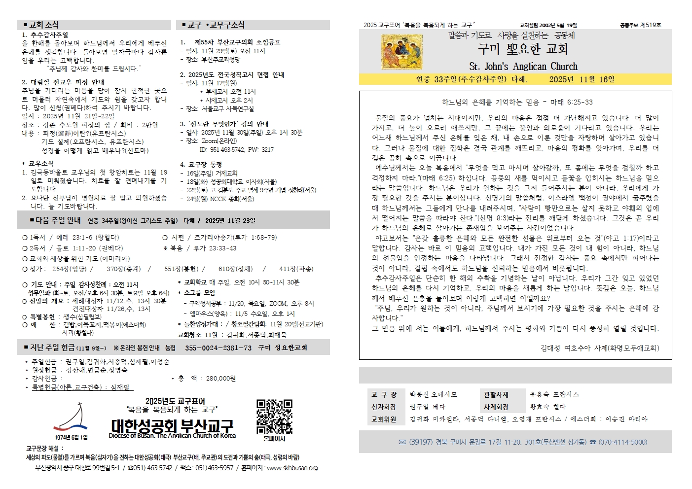 | 연중 31주일(2025. 11. 2)성요한교회 감사성찬례 주보 (0) | 2025.10.31 |